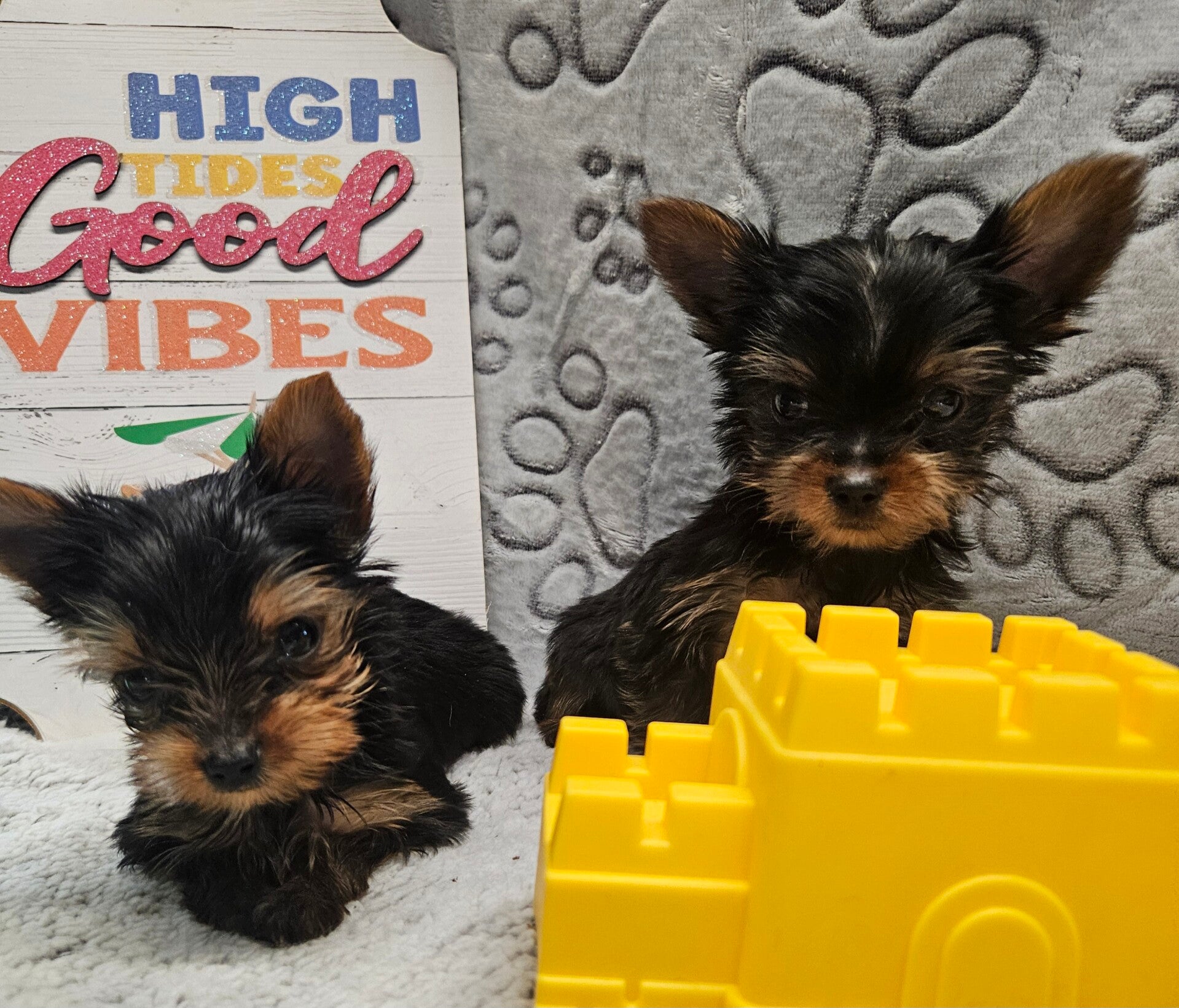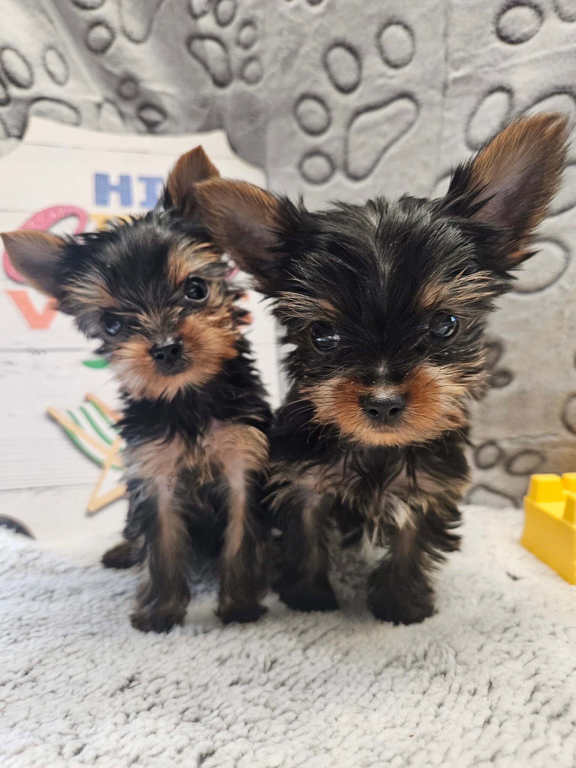 The little girl is on the left. The boy is on the right. They are 8 weeks old, and will need to stay a few more week. Have a bit more growing to do. Eating well on their own and running every where.